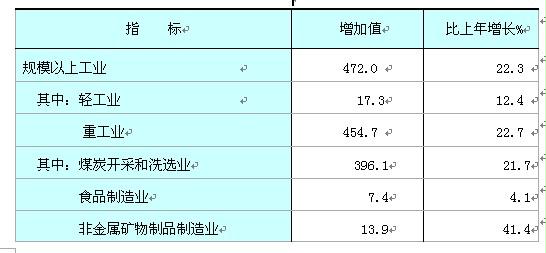 全年規模以上工業主營業務收入1085.3億元,比上年增長44.0%。其中,煤炭、電力工業分別實現主營業務收入867.9億元和69.4億元,分別增長43.8%和 14.3%;食品和非金屬礦物制造業分別實現主營業務收入26.1億元和32.3億元,分別增長19.2%和66.7%;新興接替產業共實現主營業務收入87.0億元,增長44.9%。其中,交通運輸設備制造業和醫藥工業分別實現主營業務收入2.0億元和1.9億元,分別增長134.4%和40.8%。