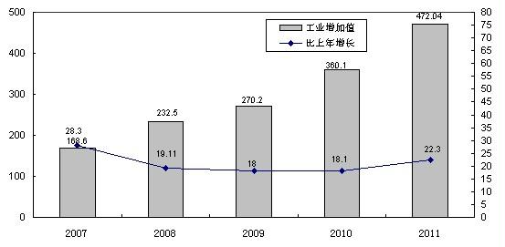 圖2 2007-2011年全市規模以上工業增加值及其增長速度