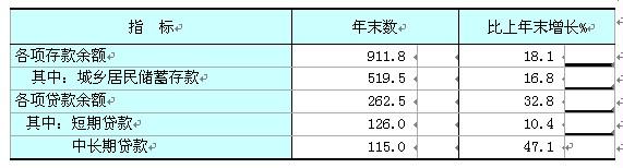 金融:年末全市金融機構本外幣各項存款余額914.8億元,比年初增加137.7億元,增長17.7%,其中人民幣各項存款余額911.8億元,比年初增加139.8億元,增長18.1%;全市金融機構本外幣各項貸款余額271.9億元,比年初增加61.7億元,增長29.4%,其中人民幣各項貸款余額262.5億元,比年初增加64.9億元,增長32.8%。