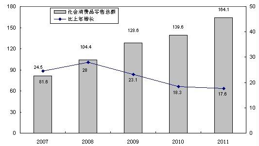 圖5 2007-2011年全市社會消費品零售總額及其增長速度