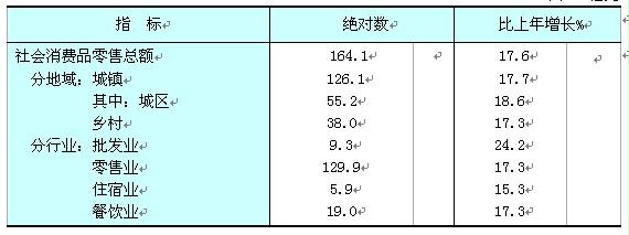 消費品零售:全年全市社會消費品零售總額164.1億元,比上年增長17.6%。其中,城鎮零售額126.1億元,增長17.7%;鄉村零售額38.0億元,增長17.3%。
