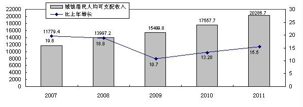 圖8 2007-2011年全市城鎮居民人均可支配收入及其增長速度