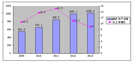 圖1 2009-2013年全市生產(chǎn)總值及增幅