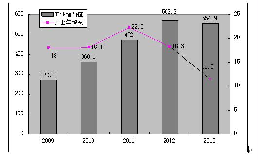 圖2 2009-2013年全市規(guī)模以上工業(yè)增加值及增速