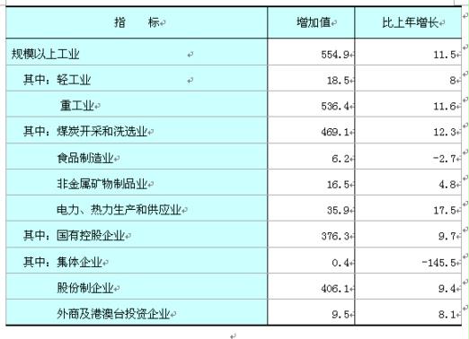 全年規(guī)模以上工業(yè)主營業(yè)務收入1157.6億元,比上年增長0.9%。其中,煤炭、電力工業(yè)分別實現(xiàn)主營業(yè)務收入875.5億元和92.5億元,分別增長-0.3%和8.1%;食品和非金屬礦物制造業(yè)分別實現(xiàn)主營業(yè)務收入27.1億元和41.7億元,分別增長3.5%和-21.8%;汽車制造業(yè)和醫(yī)藥工業(yè)分別實現(xiàn)主營業(yè)務收入1.2億元和3.2億元,分別增長18%和35.7%。