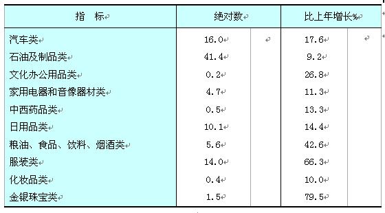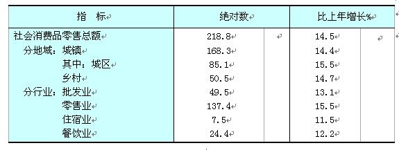 消費品零售:全年全市社會消費品零售總額218.8億元,比上年增長14.5%。其中,城鎮(zhèn)零售額168.3億元,增長14.4%;鄉(xiāng)村零售額50.5億元,增長14.7%。