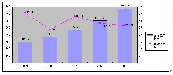 圖3 2009-2013年全市固定資產(chǎn)投資及增速