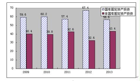 圖4 2009-2013年國有、非國有固定資產(chǎn)投資占全市固定資產(chǎn)投資比重