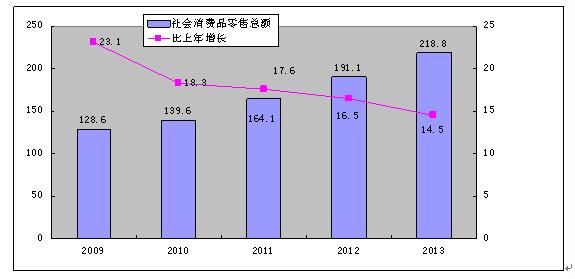 圖5 2009-2013年全市社會消費品零售總額及增速