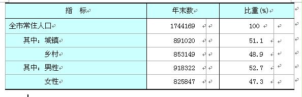 人口:據(jù)2013年人口抽樣調(diào)查,年末全市常住人口為174.4萬人,比上年末增加9203人。全年全市出生人口19620人,人口出生率為11.3‰;死亡人口9603人,死亡率為5.5‰;人口自然增長率為5.8‰。