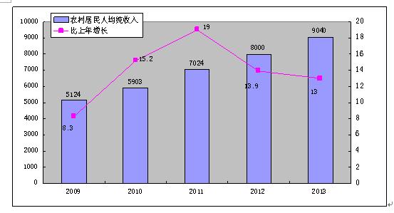 圖9 2009-2013年全市農(nóng)村居民人均純收入及增速