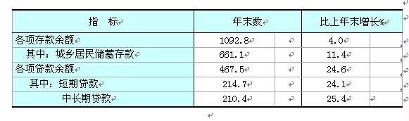 金融:年末全市金融機構(gòu)本外幣各項存款余額1094.2億元,比年初增加42.1億元,增長4.0%,其中人民幣各項存款余額 1092.8億元,比年初增加42.0億元,增長4.0%;全市金融機構(gòu)本外幣各項貸款余額469.7億元,比年初增加88.3億元,增長23.2%,其中人民幣各項貸款余額467.5億元,比年初增加92.4億元,增長24.6%。