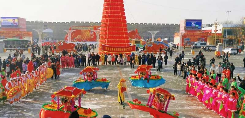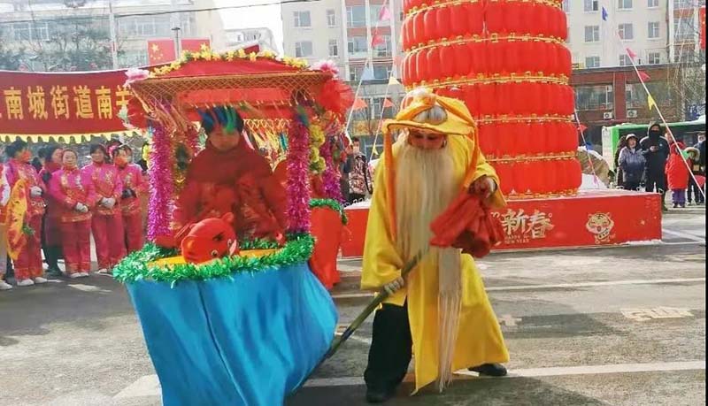 旱船表演,“艄公”劃槳引船,乘船者們與“艄公”配合默契,時而碎步快速前進,時而“波浪”旋轉顛簸,祈求風調雨順、大吉大利,展現了傳統(tǒng)民俗文化表演的魅力。