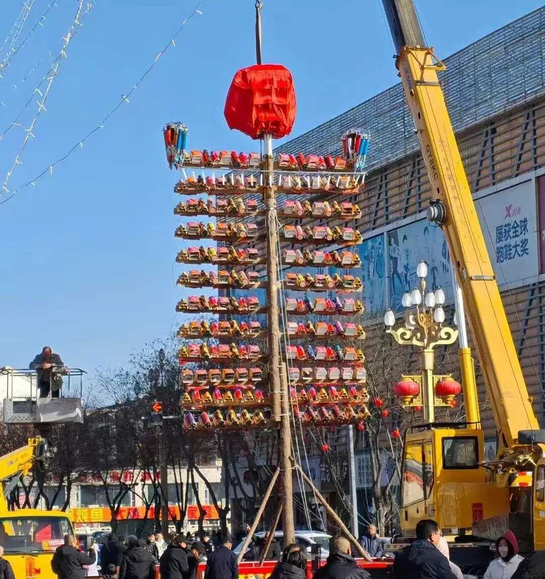 “老桿”,是朔城區一種傳統煙花,以其獨特的制作工藝和燃放效果,承載著幾代人的記憶與情感。點“老桿”作為朔城區元宵節煙花秀的特色民俗流傳至今,已有至少百年的歷史了。這項傳統民俗活動不僅是一場視覺盛宴,更是一種文化傳承。通過精心設定的“甲”和“豐”字形框架組合以及煙花展示,給人帶來視覺和心靈、記憶與傳承的多重震撼。“豐”字框架,每一根橫方木代表著一個月份,上面裝飾著各種精美的煙花,寓意著一年十二個月的美好祝愿。“甲”字形“斗子”裝好“火器”,象征著裝滿糧食的容器,寓意豐收與富足。燃放從最底層的煙花開始逐層向上點燃,直至頂部的“斗子”綻放光芒,美好愿望和豐收盛景盡顯于此。