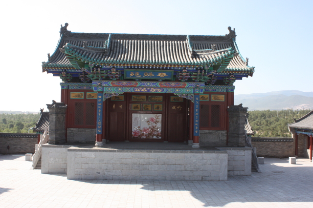 從浮雕的東側走上臺階,是一座可以容納近千人觀看演出的戲院。院子呈方形,中間是卷棚歇山廈式戲臺,戲臺中央繪有一幅牡丹水墨畫,畫的兩側分別寫著“月嘯”、“風吟”,典雅古樸、韻味十足。東西兩側分別是兩座二層小樓,是貴賓專席,后邊的石階則是一般看客的座位。