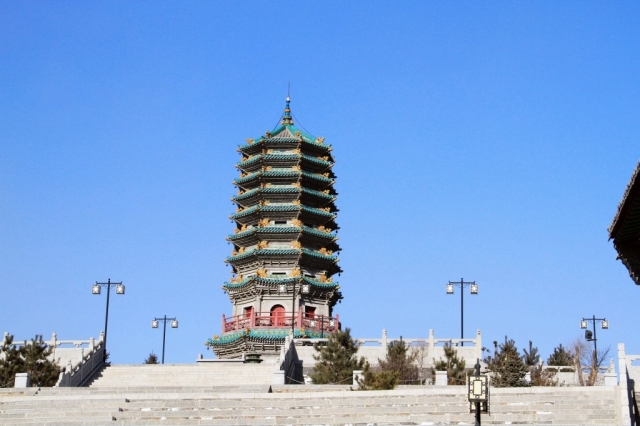 這座園林的主體建筑——文昌塔。文昌塔,高25米,塔體共九層(外九內五),是一座密檐樓閣式磚塔。文昌塔由塔座、塔身、塔剎三部分組成,八角四面。塔的正門上寫著“文昌塔”三個字,東、北、西門分別寫著“降圣”、“道弘”、“文崇”。塔層之間均是磚雕,椽、飛、斗拱構成塔檐,塔頂是由青灰色的磚瓦覆蓋,翠綠的琉璃瓦在金黃色的琉璃獸映襯下更顯金碧輝煌。一陣風吹來,滿耳都是清脆的銅鈴聲,環繞回旋在園林的上空。