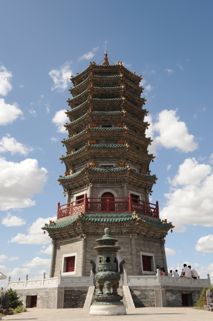 登上臺階后是一塊平臺,平臺的中央放一座文昌爐,兩側配有兩座石燈。從這里看去,平臺的西側是鼓樓,東側是鐘樓。再上一組臺階又是一塊平臺,中央放一座青銅香熏爐,上面記載著捐助建塔的慈善家名單。