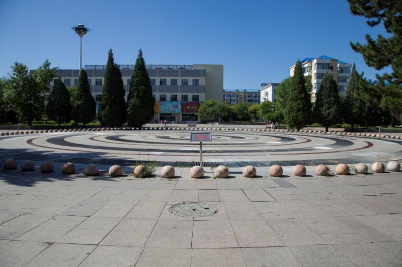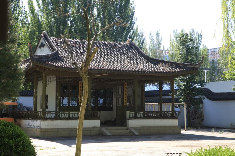下了涼亭,順著小徑繼續(xù)游園東行,就到了“園中園”。步入園中園,迎面又是一座假山。假山前園門的兩側(cè)各有一株彎曲向上的龍桑。龍桑的兩旁栽種著結(jié)著紅果的西府海棠和朝鮮黃楊球。假山后幾米處,建有一座通體黑色古色古香的閣樓式?jīng)鐾ぁ鐾さ拈T廊上有一副對聯(lián),上書“俊秀山峰北國情,碧通一徑江南韻”,字體遒勁典雅。穿過閣樓式?jīng)鐾な且粭l曲曲折折的回廊,走出回廊眼前呈現(xiàn)出一大片寬闊的草坪廣場。草坪內(nèi)每隔七八米遠就有一株高大的松柏樹或者柳樹,將一片片陰涼灑向草坪。草坪廣場右邊是健身廣場,里邊有各種健身器材可供游人選擇使用。