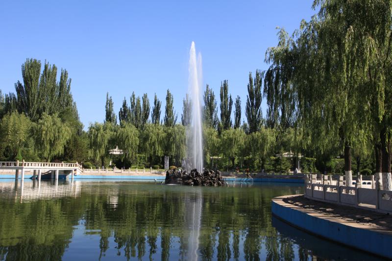 穿過露天長廊,前行幾步,就到了公園的人工湖。湖四周是造型精美的漢白玉圍欄。圍欄外側(cè)垂柳依依,將大半個腦袋探進清澈碧綠的湖水里,仿佛一圈裊裊婷婷的仕女在對鏡梳妝打扮。湖中間有一座曲曲折折的“之”字形小橋,將湖水一分為二。小橋的設計獨具匠心。西邊是方正曲折的水泥橋面、水泥橋墩,東邊卻是三孔拱形石橋。石橋上,建有一座重檐六角涼亭。涼亭飛檐翹角,雕梁畫棟,美輪美奐。廳內(nèi)的藻井上繪有西廂記壁畫。站在涼亭上向左方望去,湖內(nèi)有兩條長約6米的石雕青龍盤在一起,口吐兩米高的水珠,似在戲水;右邊湖心內(nèi)高聳著的五根鋼管,將20多米高的水柱噴向藍天,然后四灑開來,像一朵巨大的盛開著的蓮花。