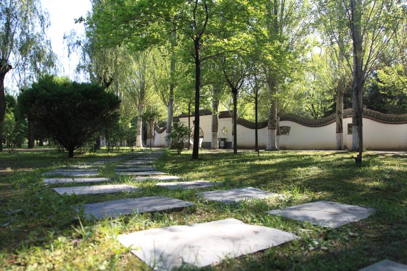順著草坪廣場的西邊小徑左拐100米,就到了牡丹園。牡丹園四周用翠綠高大茂密的松柏樹圍成正方形,中間栽種牡丹的地方則呈圓形,四角鑲鋪了綠色的草坪。牡丹園直徑100米,每當陽春四月,游人來這里,就可觀賞到國色天香的牡丹花。