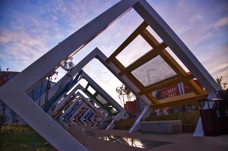 五步一柱、十步一景,噴泉外圍放置了雕刻著金城、馬邑、峙峪字樣的巖石,象征著朔州歷史上的光輝節點。不規則的鐵架長廊藝術氣息十足,游人可在其間散步或駐足,偶遇一份文靜淡雅,或邂逅倏忽而至的靈感。在這里,建筑與地域文化相融,珍藏著獨屬于朔州的文化浪漫。
