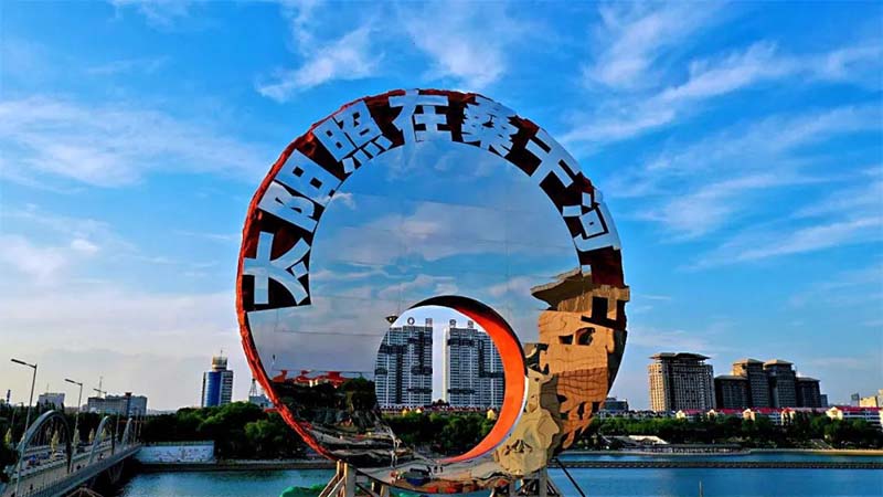 為了活化“太陽照在桑干河上”這一美景,清華美院展示藝術研究所精心設計,將“太陽”作為主體意象進行打造,雕塑中央部位圓形孔洞寓意“朔”與新月,象征城市高質量發展的新起點。整體巧妙地融主題性、紀念性、裝飾性、標志性、藝術性等特色于一體,寓意太陽從桑干河畔冉冉升起,昭示著希望與未來,激人奮進。