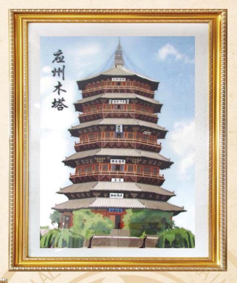 山西民間刺繡歷史悠久,題材廣泛,內容豐富,具有反映風土人情特色;山西民間刺繡,有著自己獨特的藝術風格,圖案純樸,色彩艷麗,構圖簡潔、造型夸張、針法多樣、繡工精致,名揚海外。此款刺繡產品為朔州應縣木塔。
